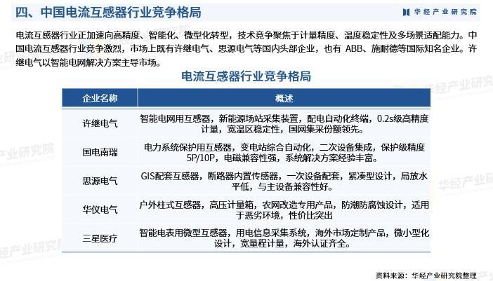 电流互感器行业正加速向高精度、智能化、微型化转型,技术竞争聚焦于计量精度、温度稳定性及多场景适配能力。中国电流互感器行业竞争激烈,市场上既有许继电气、思源电气等国内头部企业,也有 ABB、施耐德等国际知名企业。许继电气以智能电网解决方案主导市场。
