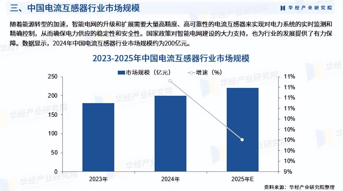 随着能源转型的加速,智能电网的升级和扩展需要大量高精度、高可靠性的电流互感器来实现对电力系统的实时监测和精确控制,从而确保电力供应的稳定性和安全性。国家政策对智能电网建设的大力支持,也为行业的发展提供了有力保障。数据显示,2024年中国电流互感器行业市场规模约为200亿元。