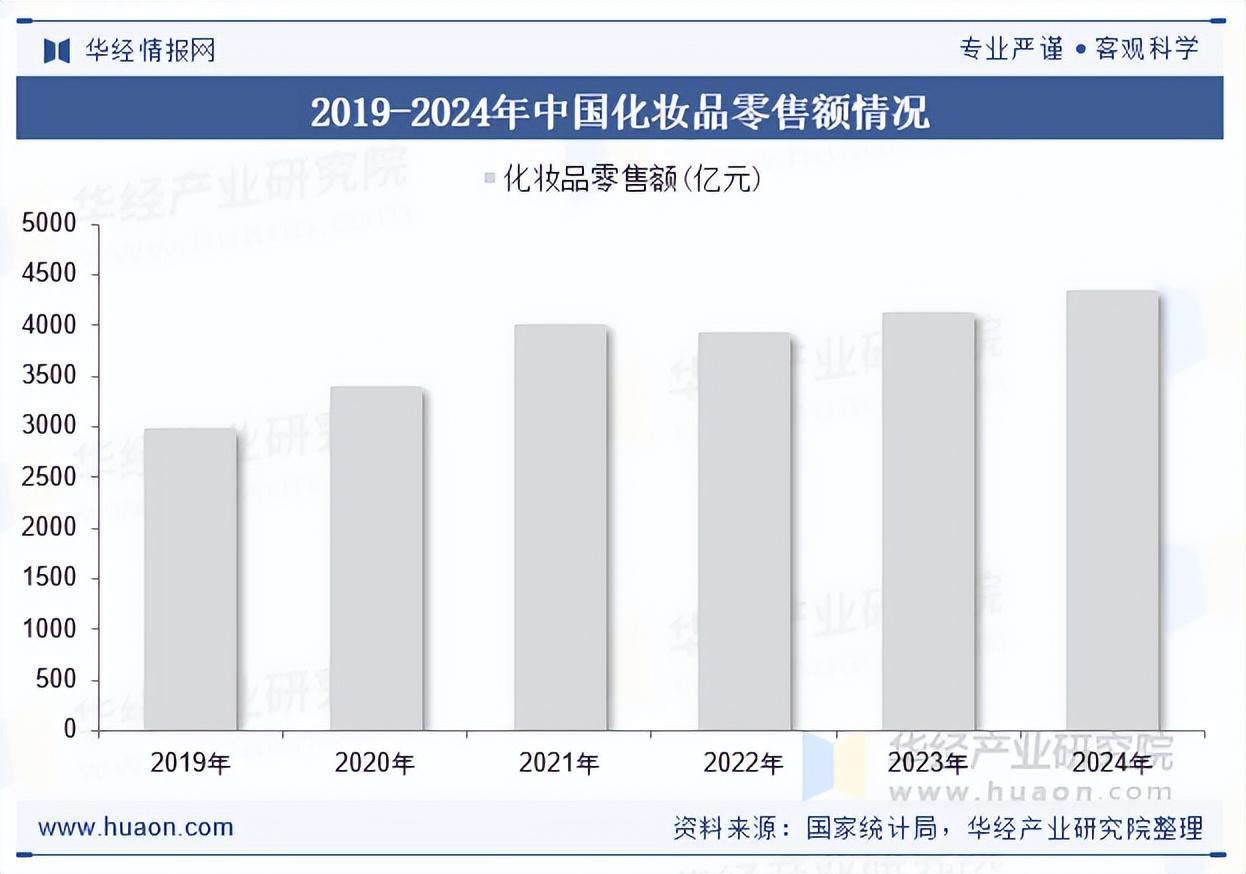 化妆品主要产品主要分为护肤品、护发品、彩妆、沐浴产品、口腔用品、婴幼儿用品、香水等,而花瓣沐浴露主要用于清洁身体肌肤,去除污垢、油脂及汗液等,保持身体皮肤的清洁卫生,并且,开创性地将天然花瓣实体与沐浴露相结合,为沐浴产品领域开辟全新的发展方向。2024年,中国化妆品零售额为4357亿元。