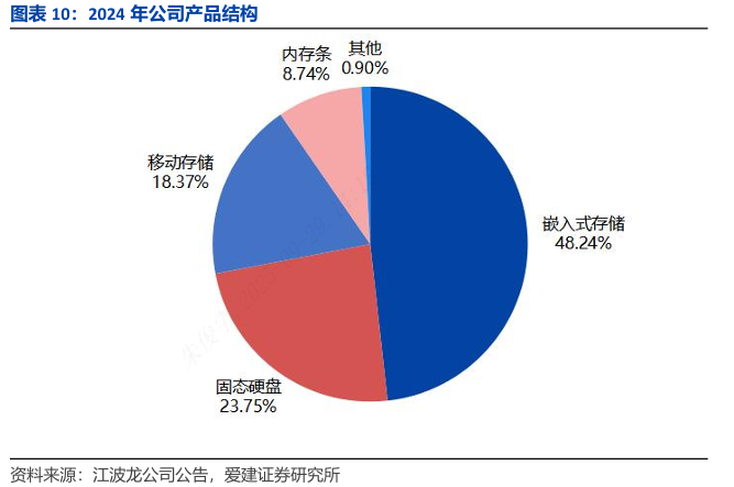 产品布局上,公司聚焦消费电子、数据中心等核心领域,提供高质量NAND Flash与DRAM 存储芯片产品。2024年公司产品涵盖嵌入式存储、固态硬盘、移动存储及内存条四大品类:其中嵌入式存储为核心产品,不仅品类丰富且性能强劲,可适配多场景需求;固态硬盘则属于大容量NANDFlash存储产品,能满足笔记本电脑、台式机、一体机、视频监控及网络终端等场景的应用需求。嵌入式存储与固态硬盘的营收合计占比达71.99%。