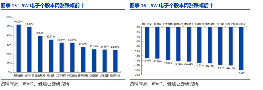 本周SW电子三级行业指数涨跌幅前三分别是:半导体设备(+15.56%),集成电路制造(+14.36%),半导体材料(+12.30%);涨跌幅后三分别是:印制电路板(-7.33%),光学元件(-5.44%),被动元件(-2.61%)。