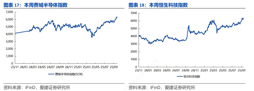 费城半导体指数(SOX)本周涨跌幅为+0.84%;恒生科技指数本周涨跌幅为-1.58%。