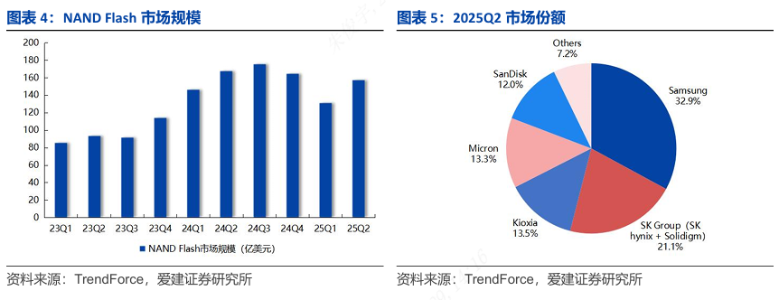 2025年Q2,尽管NAND Flash ASP仍小幅下滑,但原厂减产策略有效缓解了供需失衡,叠加中、美政策推动及需求端支撑(AI服务器放量拉动SSD需求,PC、智能手机消费电子需求回暖),出货量实现大幅增长。在此背景下,NAND Flash龙头企业进一步巩固市场地位,TrendForce数据显示,2025Q2 NAND Flash市场份额前五的企业分别为Samsung(32.9%)、SK Group(21.1%)、Kioxia(13.5%)、Micron(13.3%)、SanDisk(12.0%)。