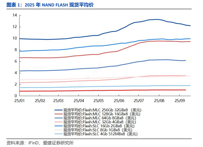 2025年9月17日,据DigiTimes报道2025年第四季度NAND Flash合约价格预计将大幅上涨15%-20%,打破了传统的年末降价格局。截至9月22日,Flash(MLC 256 GB)、Flash(MLC 128 GB)、Flash(SLC 16 GB)、Flash(SLC 8 GB)价格分别为12.20美元、9.45美元、9.94美元、3.47美元。