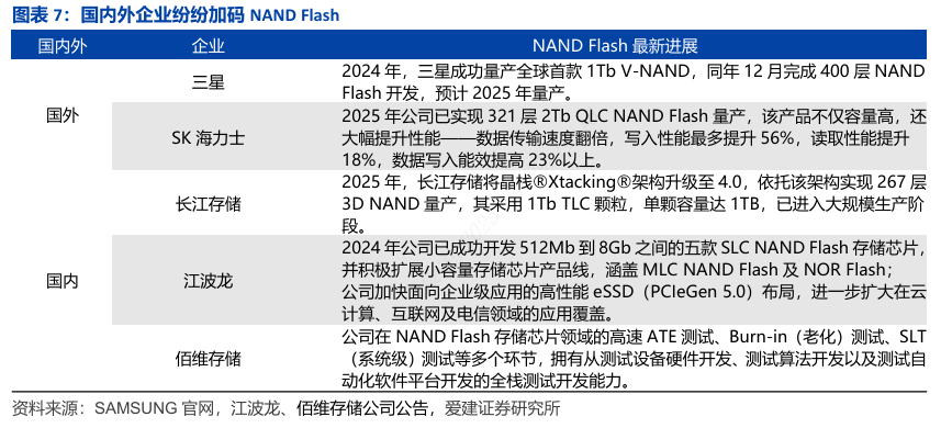 国内外企业正加速布局 NAND Flash领域,技术迭代与产品创新持续突破。国外方面,三星于2024年成功量产全球首款1Tb V-NAND,并在同年12月完成400层NAND Flash开发,计划2025年实现量产;SK海力士则在2025年达成321层2Tb QLC NANDFlash量产,该产品不仅容量领先,更是实现了数据传输速度翻倍、写入性能最多提升56%、读取性能提升18%及数据写入能效提高23%以上的综合突破。国产厂商中,长江存储、江波龙、佰维存储依托技术架构创新、细分场景深耕与核心环节攻坚,加速国产NAND Flash领域突破。