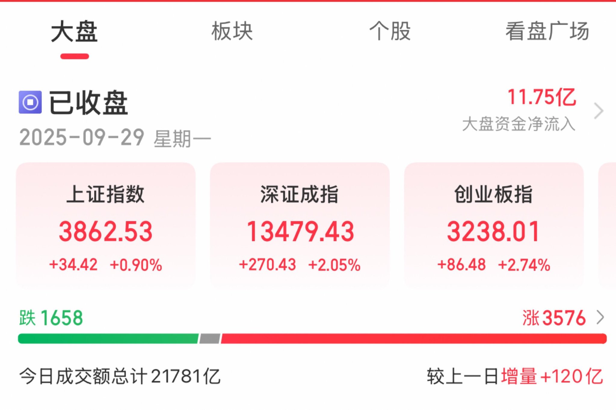 A股三大指数今日集体上涨,截至收盘,上证指数涨0.9%,深证成指涨2.05%,创业板指涨2.74%,北证50涨0.69%。沪深京三市全天成交额21781亿元,较上日放量120亿元。全市场超3500只个股上涨。