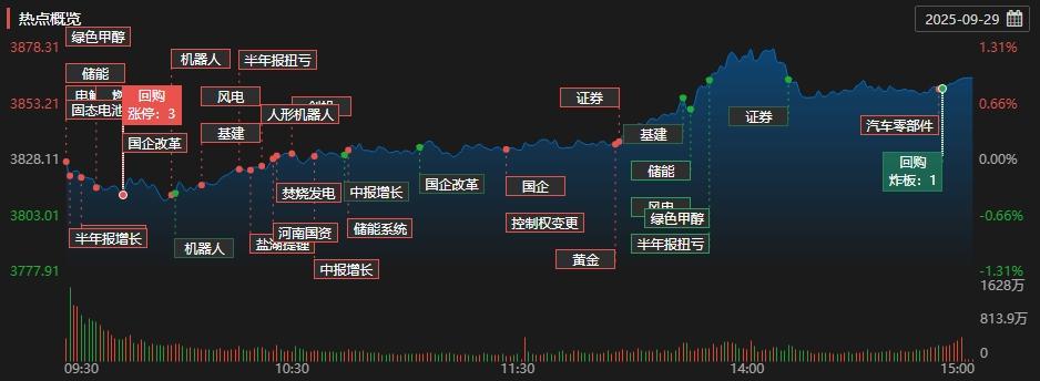 盘面上,证券板块午后大幅走强,华泰证券、国盛金控(002670)、广发证券盘中涨停,东方证券、湘财股份(600095)、东吴证券涨幅居前。黄金、有色金属板块表现强势,卧龙新能(600173)、兴业银锡(000426)、盛达资源(000603)涨停。固态电池、储能板块早盘爆发,万润新能、丰山集团(603810)、天赐材料(002709)等10余股涨停。此外,人形机器人、存储芯片、房地产、钢铁板块盘中均有所拉升。另一方面,教育板块震荡走低,凯文教育(002659)、中国高科(600730)盘中触及跌停。猪肉、食品股同样表现落后,京基智农(000048)、傲农生物(603363)、龙大美食(002726)纷纷下挫。