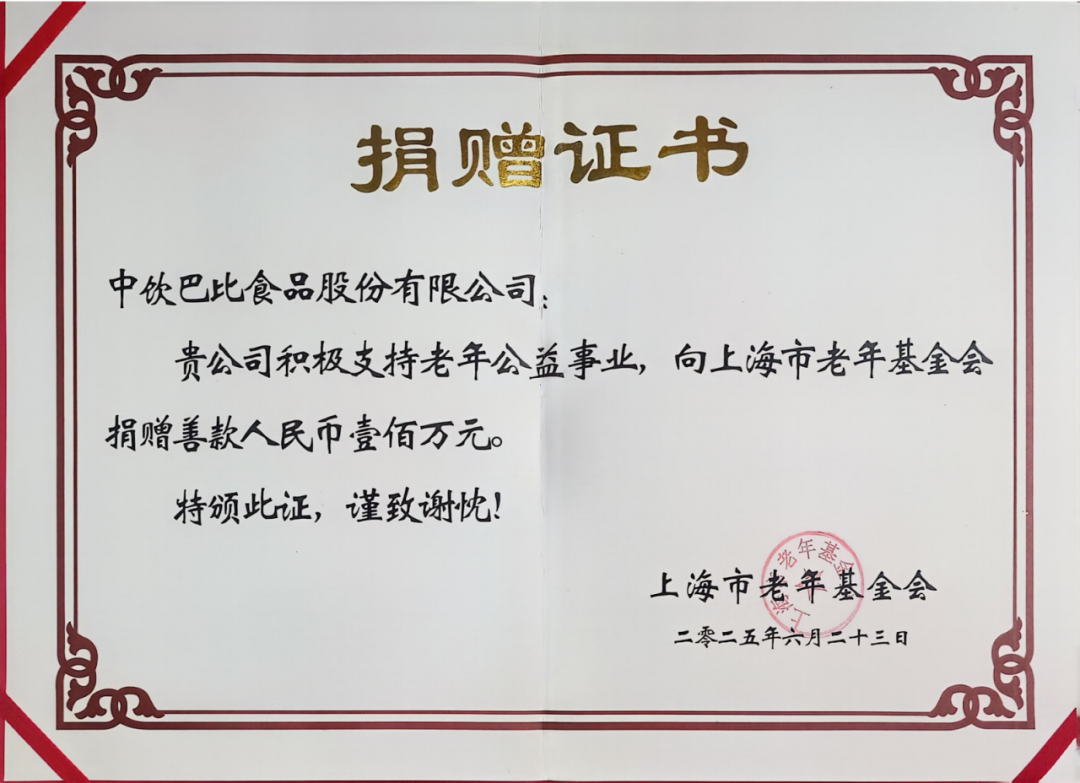 6月末,巴比向上海市老年基金会松江区代表处捐赠100万元,专项用于车墩镇助老项目。这份爱心将化作长者餐食与贴心服务,助力当地长辈安享温暖晚年。