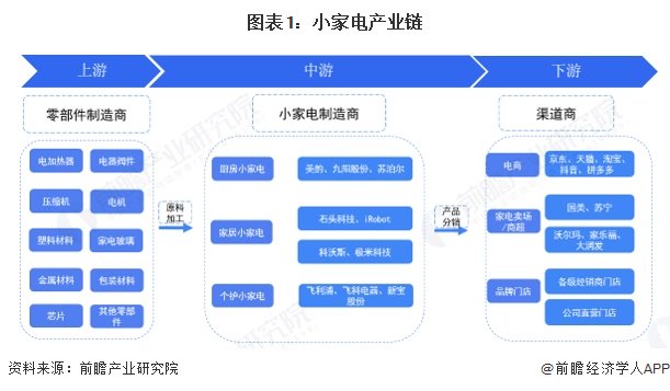 小家电产业链主要分为上游原材料和零部件供应、中游小家电制造和下游小家电销售三大环节。小家电行业上游原材料和零部件包括电加热器、电器阀件、塑料、剥离、金属材料、包装材料等各类零部件供应商,由于各种不同小家电所需原材料零部件不同,因此上游覆盖企业范围较广,品牌也较多元化;中游小家电制造企业包含了国外大企业和国内家电综合制造企业(如美的)、小家电制造企业各类型企业;下游主流销售渠道有综合电商平台(如天猫商城、京东商城等)、线下家电卖场(如苏宁、国美)、大型商超、各级经销商门店、公司直营门店等各类分销渠道。