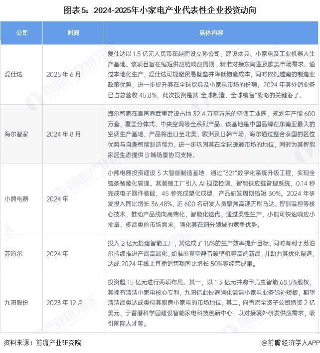 2024年以来,小家电产业代表性企业的投资动向主要包括东南亚地区设立工厂基地、中高端小家电生产、智能装备生产项目等。小家电产业代表性企业最新投资动向如下: