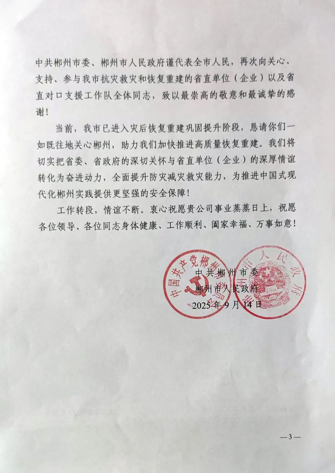 近日,郴州市委、市人民政府发来一封情真意切的感谢信,再次向关心、支持、参与抗灾救灾和恢复重建的湘电集团及工作队全体队员,致以最崇高的敬意和最诚挚的感谢!