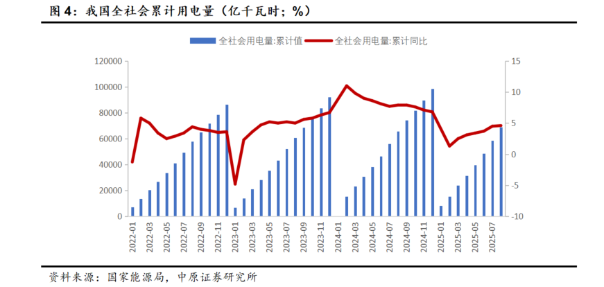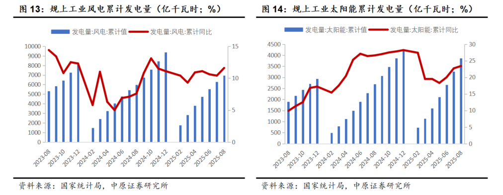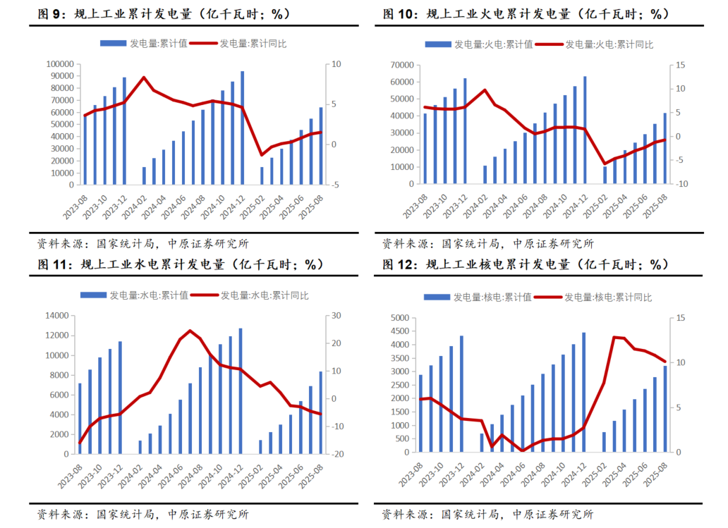 供给端:2025年8月,规上工业风电增速加快,水电降幅扩大,火电、核电、太阳能发电增速放缓。从发电量占比看,2025年1—8月,规上工业火电占比65.04%,规上工业水电占比13.07%,规上工业核电占比5.01%,规上工业风电占比10.85%,规上工业太阳能占比6.02%。