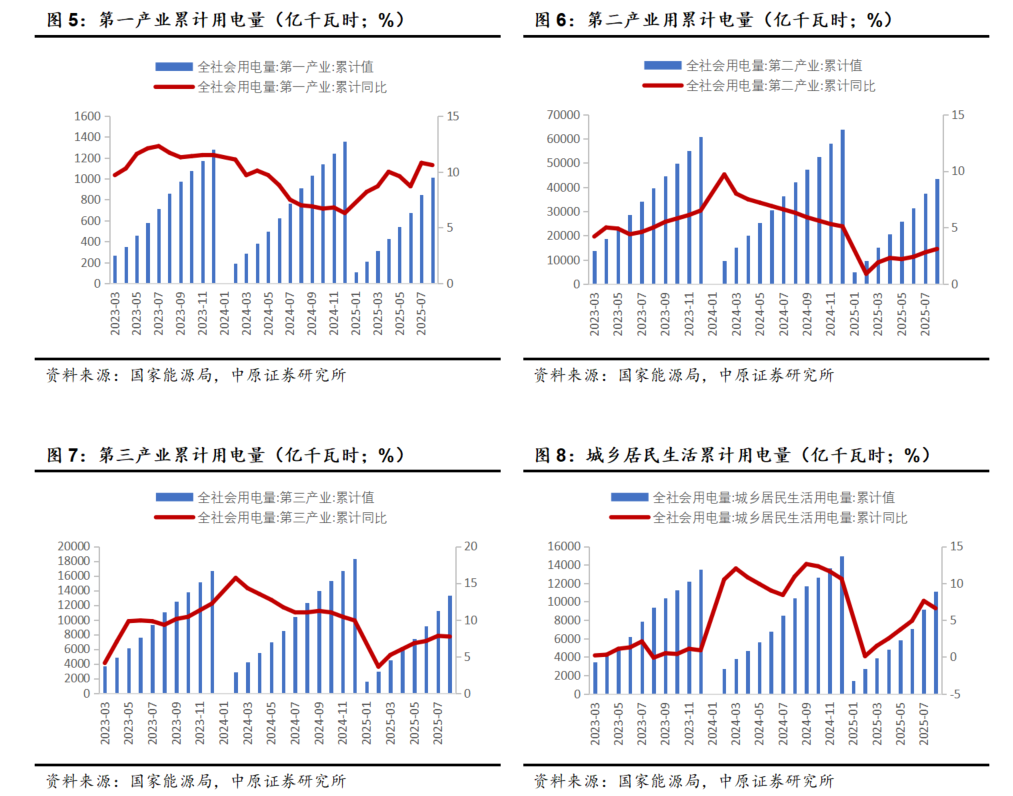 2025年8月,第一产业用电量增速最高,超过10%。从分产业用电看,2025年8月,第一产业用电量164亿千瓦时,同比增长9.7%;第二产业用电量5981亿千瓦时,同比增长5.0%;第三产业用电量2046亿千瓦时,同比增长7.2%;城乡居民生活用电量1963亿千瓦时,同比增长2.4%。2025年1—8月,一产业用电量1012亿千瓦时,同比增长10.6%;第二产业用电量43386亿千瓦时,同比增长3.1%;第三产业用电量13297亿千瓦时,同比增长7.7%;城乡居民生活用电量11094亿千瓦时,同比增长6.6%。