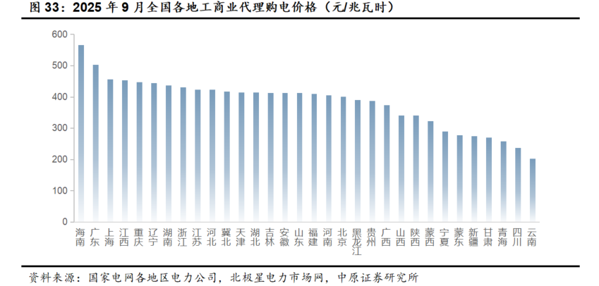 根据各地电力公司数据,2025年9月代理购电价格排名前三的分别是海南(566.196元/兆瓦时)、广东(503元/兆瓦时)、上海(456元/兆瓦时),分别较上月价格上涨68.4元/兆瓦时、上涨0.8元/兆瓦时、下跌28.4元/兆瓦时;排名后三的分别是云南(203.089元/兆瓦时)、四川(237.806元/兆瓦时)、青海(258.549元/兆瓦时),分别较上月下跌17.22元/兆瓦时、下跌39.58/兆瓦时、下跌14.89元/兆瓦时。