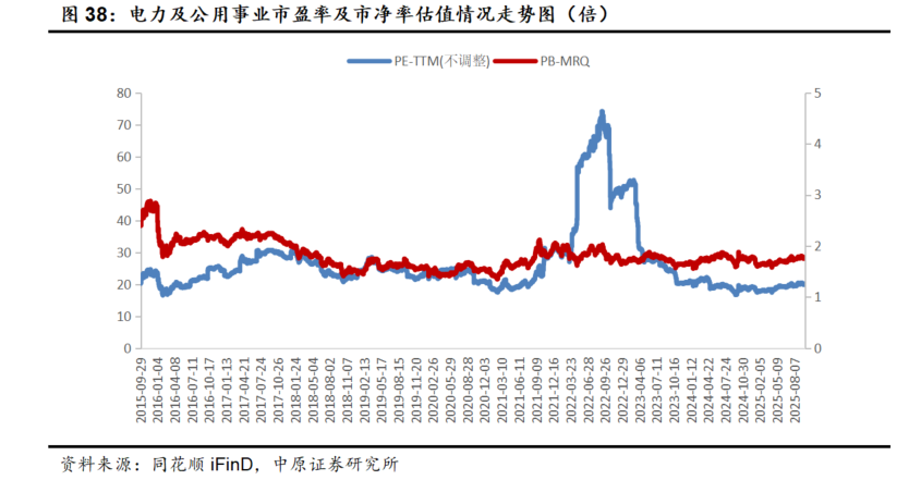 板块PE估值低于历史中枢,PB估值处于历史中枢附近。截至2025年9月26日,电力及公用事业板块市盈率20.01倍,低于近十年中位数23.41倍,近十年分位点为29.65%;板块市净率1.77倍,高于近十年中位数1.75倍,近十年分位点为54.85%。