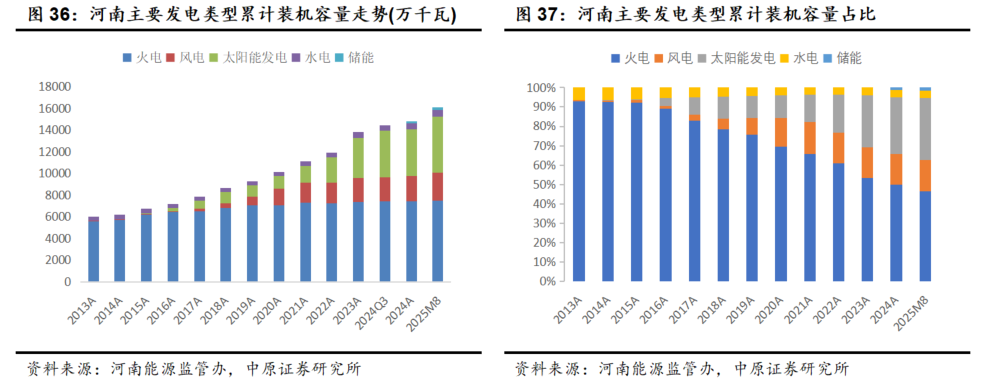 装机容量:截至2025年8月底,河南省装机容量16123万千瓦,同比装机增加1601万千瓦。其中,风光储装机合计占比49.63%。