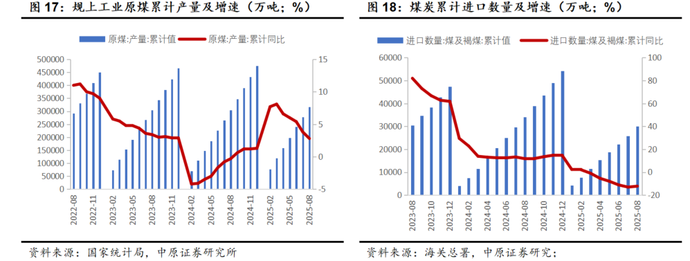 原煤生产、煤炭进口维持负增长,但降幅均有所收敛。根据国家统计局数据,2025年8月,规上工业原煤产量3.9亿吨,同比减少3.2%,降幅较2025年7月收窄0.6个百分点;2025年1—8月,规上工业原煤产量31.7亿吨,同比增长2.8%,降幅较2025年7月收窄16.2个百分点。根据海关总署数据,2025年8月,进口煤炭4274万吨,同比减少6.7%;2025年1—8月,进口煤炭29994万吨,同比减少12.2%。