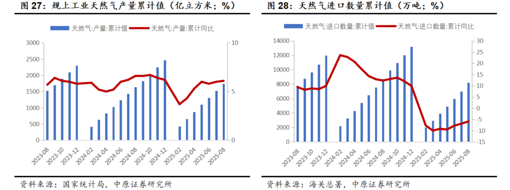 天然气生产增速放缓,进口增速由负转正。根据国家统计局数据,2025年8月,规上工业天然气产量212亿立方米,同比增长5.9%,增速较2025年7月份放缓1.5个百分点;2025年1—8月,规上工业天然气产量1737亿立方米,同比增长6.1%。根据海关总署数据,2025年8月,我国进口天然气1185万吨,同比增加0.76%,2025年7月为同比减少2.09%;2025年1—8月,我国进口天然气8191万吨,同比减少5.9%。
