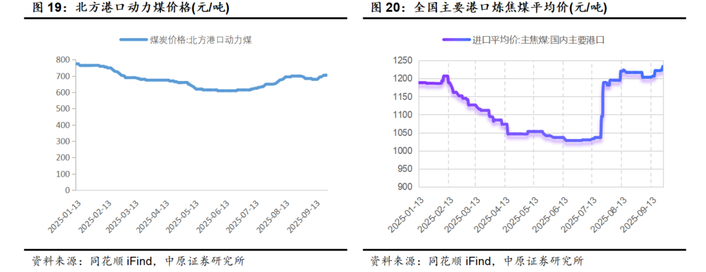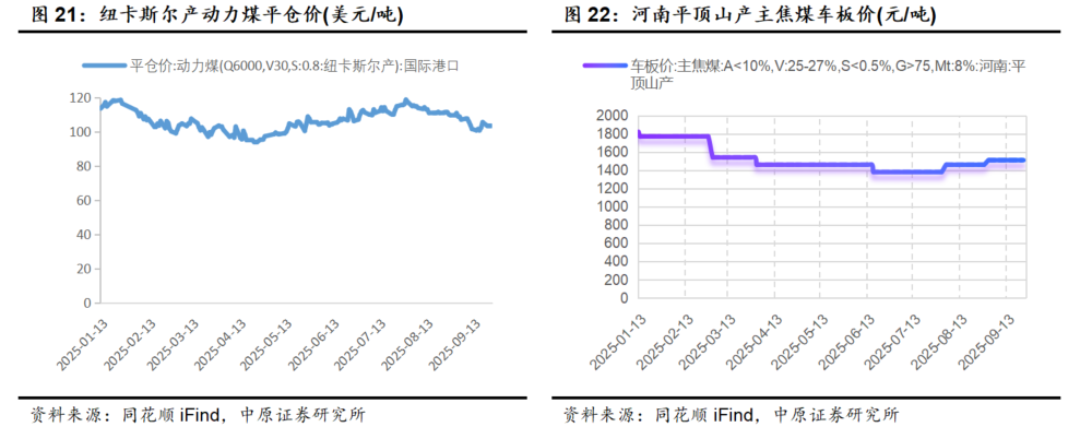 反内卷推动国内煤价企稳回升。2025年9月25日,北方港口动力煤价为705元/吨,月累计上涨0.71%,年累计下跌8.44%;全国主要港口炼焦煤平均价为1556元/吨,月累计上涨2.93%,年累计上涨9.71%;纽卡斯尔产动力煤平仓价为103美元/吨,月累计下跌5.66%,年累计下跌17.02%;平顶山产主焦煤车板价为1510元/吨,月累计上涨3.42%,年累计下跌21.35%。