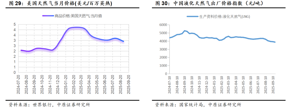 价:2025年8月,美国天然气价格为2.91美元/百万英热,同比减少8.82%。2025年9月20日,我国液化天然气价格为3864元/吨,本月减少2.22%。
