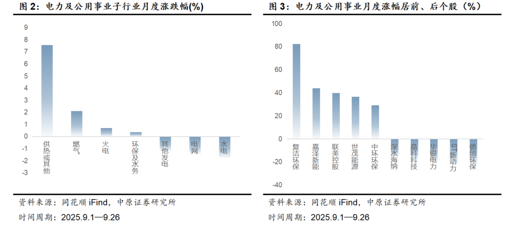 子行业方面,截至2025年9月26日收盘,9月涨跌幅排名依次为:供热或其他(7.57%)、燃气(2.12%)、火电(0.71%)、环保及水务(0.37%)、其他发电(-1.20%)、电网(-1.45%)、水电(-1.77%)。截至2025年9月26日收盘,行业227只A股81只上涨,3只收平,143只下跌。月度涨幅前5的个股依次为复洁环保(82.3%)、嘉泽新能(44.19%)、联美控股(39.91%)、世茂能源(36.73%)、中环环保(29.34%);跌幅前5个股依次为德创环保(-21.79%)、ST新动力(-21.28%)、华银电力(-19.85%)、晶科科技(-17.41%)、深水海纳(-15.89%)。