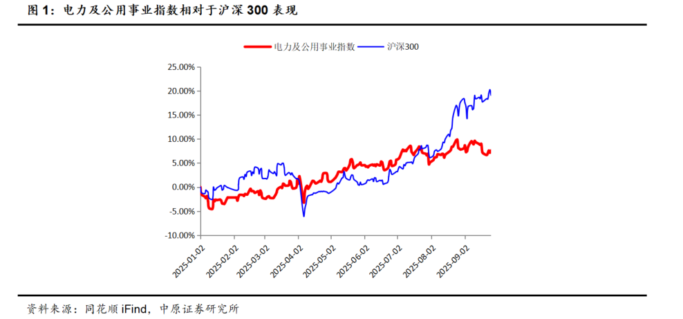 行情回顾:9月电力及公用事业指数表现弱于市场。截至2025年9月26日,本月中信电力及公用事业指数下跌0.20%,跑输沪深300(1.19%)1.39个百分点。