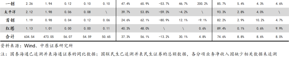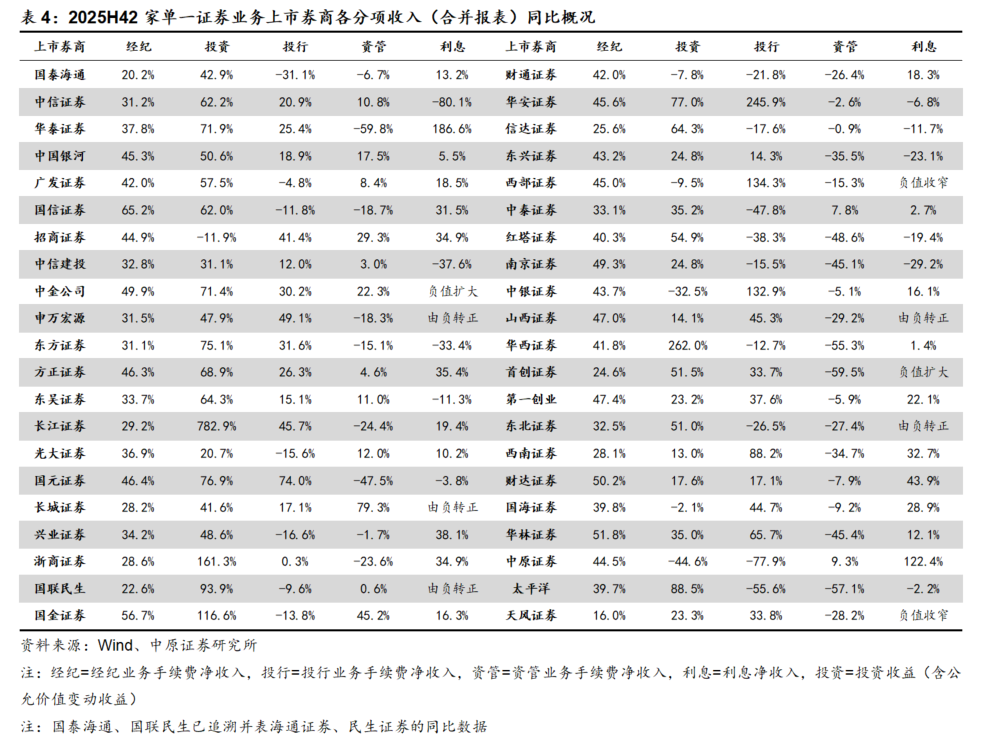 从2025年上半年42家单一证券业务上市券商合并利润表各分项收入的同比变动看(因国泰海通吸收合并海通证券、国联民生并表民生证券对同比数据进行追溯调整后),经纪业务手续费净收入、投资收益(含公允价值变动)同比分别+37.3%、+50.1%,投行业务手续费净收入、资管业务手续费净收入、利息净收入同比分别+7.7%、-6.8%、+17.2%。虽然统计口径和统计样本的差异造成行业数据与上市券商合并报表数据存在一定的差异,但整体趋同性较为显著,即经纪业务、投资收益(含公允价值变动)驱动2025年上半年行业整体经营业绩同比实现明显改善。