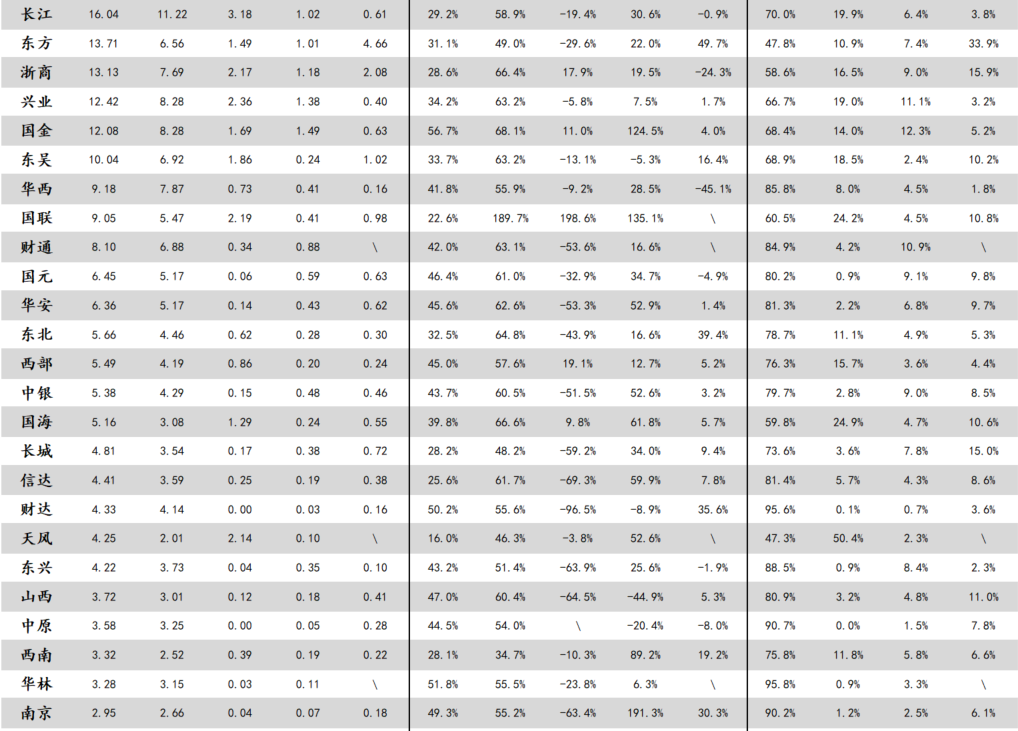 交易单元席位租赁净收入方面,2025H共14家公司的同比表现优于上市券商均值,占比33.3%。其中,增速前5位分别为西部证券(19.1%)、浙商证券(17.9%)、中信证券(16.7%)、国金证券(11.0%)、国海证券(9.8%);增速后5位分别为财达证券(-96.5%)、首创证券(-80.9%)、信达证券(-69.3%)、山西证券(-64.5%)、东兴证券(-63.9%)。(因无法追溯同比数据,剔除因并表因素导致增速异常的国联民生)