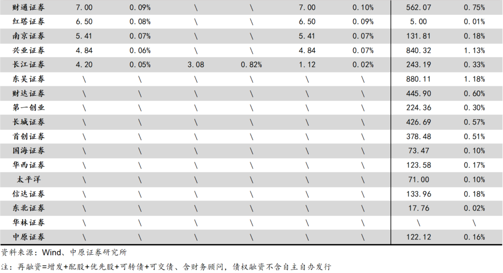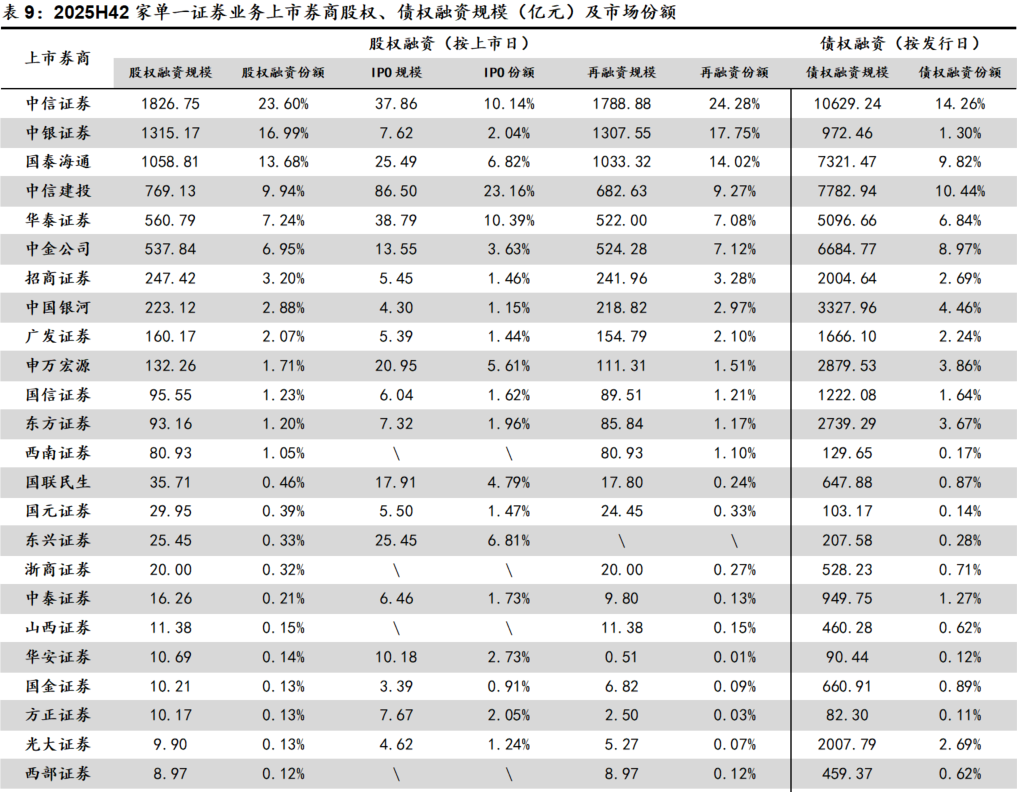 股权融资业务方面,根据Wind的数据进行统计,2025年上半年股权融资承销金额(包括首发、增发、配股、优先股、可转债、可交换债,按上市日)排名前5(CR5)证券公司的合计市场份额为71.17%,较2024年+6.07pct,再创历史新高;前10(CR10)证券公司的合计市场份额为88.67%,较2024年+9.42pct,同步再创历史新高。上市券商中,中信证券(23.60%)、中银证券(16.99%)、国泰海通(13.68%)、中信建投(9.94%)、华泰证券(7.24%)排名股权融资承销规模前5位;中信建投(23.16%)、华泰证券(10.39%)、中信证券(10.14%)、国泰海通(6.82%)、东兴证券(6.81%)排名IPO承销规模前5位;中信证券(24.28%)、中银证券(17.75%)、国泰海通(14.02%)、中信建投(9.27%)、中金公司(7.12%)排名再融资承销规模前5位。