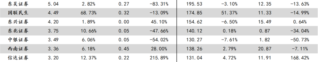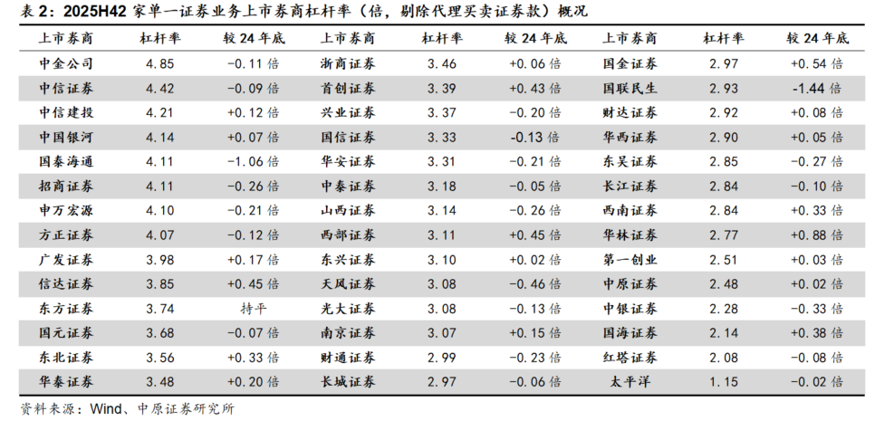根据中国证券业协会公布的行业数据进行计算,剔除客户交易结算资金余额后,2025年上半年证券行业平均杠杆率为3.29倍,较2024年全年微幅下降0.02倍,维持在2021年以来的相对高位区间窄幅震荡。25H行业平均杠杆率微降,预计一是由于上半年固定收益市场明显降温,进而抑制了行业内各公司主动扩表的动力,个别上市券商出现了缩表现象;二是上半年客户交易结算资金余额较2024年底+9.30%,出现较快增长,且增幅高于总资产(较2024年底+4.10%)及净资产(较2024年底+3.19%)增幅。