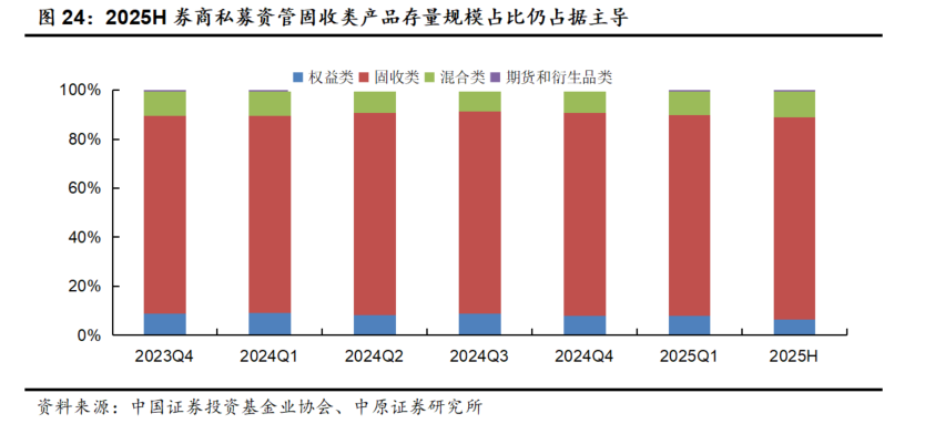 私募资管投资类型仍以固收为主。根据中国证券投资基金业协会的统计,截至2025年6月底,券商私募资管按投资类型分为权益类、固收类、混合类、期货和衍生品类,产品存量规模占比分别为6.5%、82.5%、10.4%、0.6%,较2024年底分别-1.5pct、-0.2pct、+1.7pct、持平。2025H券商私募资管权益类+混合类产品存量规模占比为16.9%,较2024年底+0.2pct,出现微幅提高,固收类产品存量规模虽然略有下降,但仍占据主导地位。