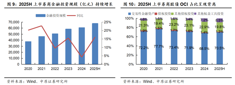 按照会计科目进行分类,截至2025年6月底,42家单一证券业务上市券商交易性金融资产、债权投资、其他债权投资(债券OCI)、其他权益工具投资(股票OCI)合计规模分别为47556亿元、853亿元、13369亿元、5716亿元,较2024年底分别+14.4%、-0.2%、-3.6%、+30.8%。其中,上市券商债券OCI合计规模小幅下滑,占比由2024年底的22.9%下降至2025H的19.8%,预计主要由于报告期内部分上市券商处置存量债券OCI释放投资收益,以对冲固收自营的下滑压力、增强固收自营投资业绩的韧性。上市券商股票OCI合计规模仍保持明显增长,占比由2024年底的7.2%提升至2025H的8.5%,显示在高股息资产持续走强,央行互换便利持续推广的背景下,上市券商通过股票OCI账户增配高股息资产,以获取稳定的息差收益、增强权益自营稳定性的动力依然较强。