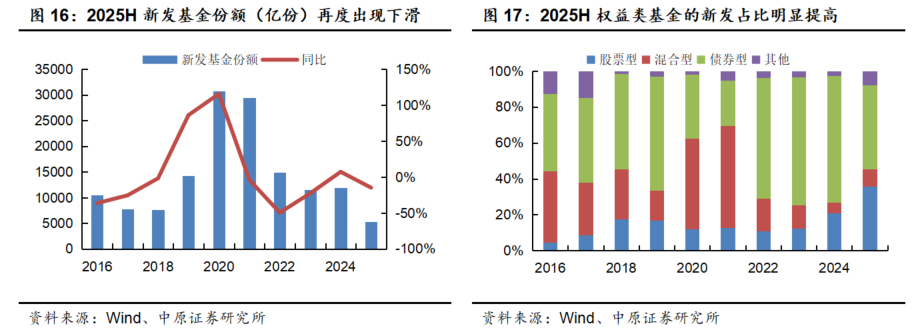 新发基金规模再度转为下滑。根据Wind的数据进行统计,2025年上半年新发基金份额(认购截止日)为5289.86亿份,同比-19.87%,在2024年小幅企稳回升后再度转为下滑。其中,股票型、混合型、债券型新发基金规模占比分别为35.62%、9.90%、46.53%,较2024年全年分别+14.52pct、+4.00pct、-23.71pct,权益类基金的新发占比明显提高,固收类基金的新发占比则出现明显下降。