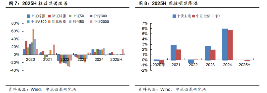 固收明显降温。受监管力度加强、降准降息预期扰动、利率债供给增加、市场资金面偏紧、权益市场风险偏好阶段性回升等多方面因素的影响,2025年一季度各固定收益类指数出现近年来最大幅度的季度调整。二季度初在权益市场出现波动后固收指数明显转强,并收复了大部分一季度跌幅,随后固收市场进入长达两个半月的震荡整理周期。上半年十年期国债期货指数基本平盘、中证全债(净)指数下跌0.20%,整体涨跌幅显著收敛。整体看,上半年固收市场在经历去年最大年度涨幅后陷入高位震荡整理,行业固定收益类自营业务的经营环境同比明显降温。