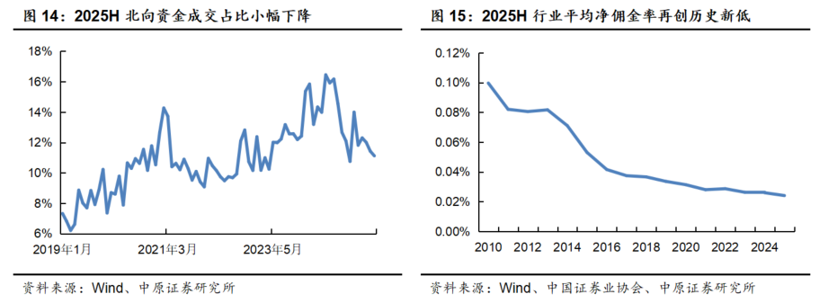 行业平均净佣金率再创历史新低且降幅再度扩大。根据中国证券业协会的统计,2025年上半年行业共实现代理买卖证券业务净收入(含交易单元席位租赁)688.42亿元。由此计算,将北向资金成交占比按2025年上半年月加权平均值12.17%的比例剔除后,2025年上半年行业平均净佣金率为2.41‱(万分之2.41),较2024年-7.21%,再创历史新低且降幅再度有所扩大。