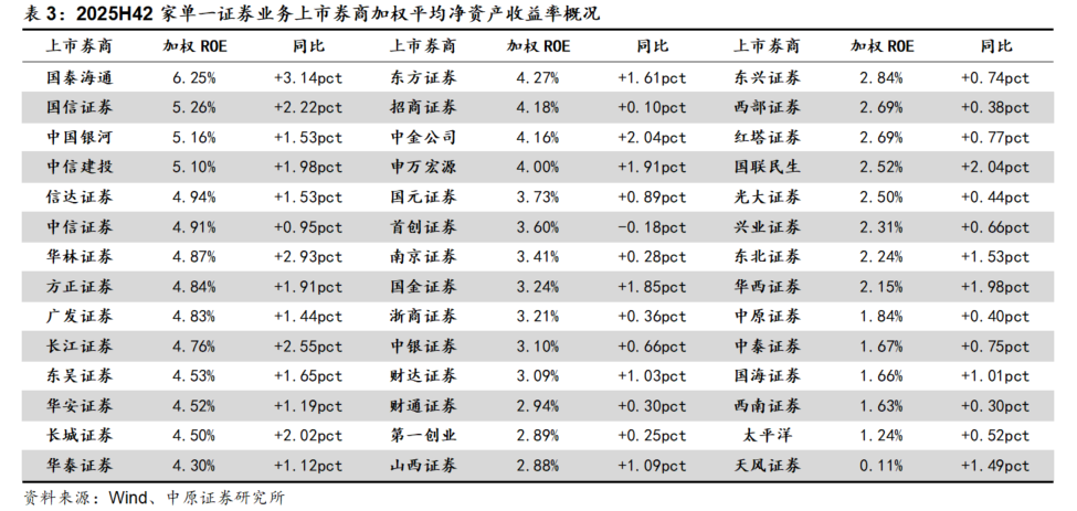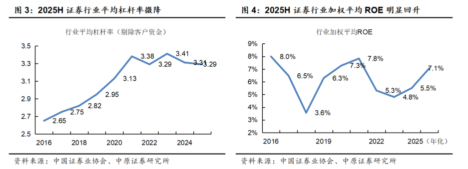根据中国证券业协会公布的行业数据进行计算,2025年上半年证券行业加权平均净资产收益率为3.53%,同比+0.85个百分点,年化后连续第二年实现回升,且回升的幅度较2024年明显扩大。