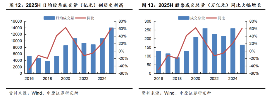 日均成交量创历史新高。根据Wind的数据进行统计,2025年上半年全市场日均股票成交量为13904亿,同比+61.12%,较2024年全年+30.73%;成交总量为162.68万亿元,同比+61.12%。2025H全市场日均股票成交量创历史新高,且增幅较2024年全年明显扩大。