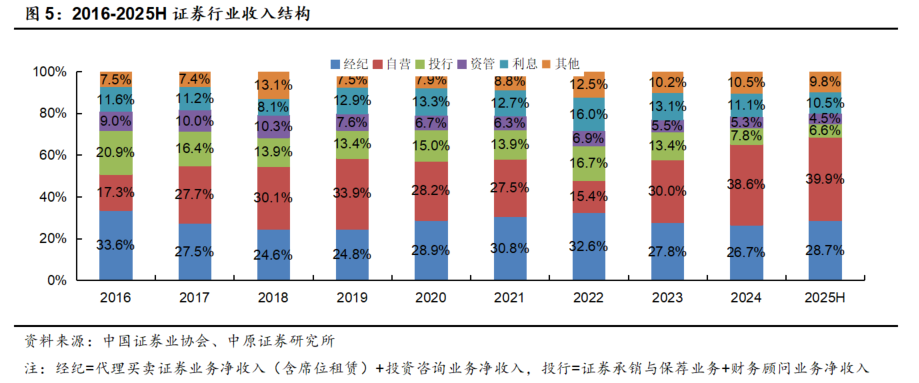 根据中国证券业协会公布的行业数据进行统计,2025年上半年行业经纪、自营、投行、资管、利息、其他净收入占比分别为28.7%、39.9%、6.6%、4.5%、10.5%、9.8%,2024年行业经纪、自营、投行、资管、利息、其他净收入占比分别为26.7%、38.6%、7.8%、5.3%、11.1%、10.5%。
