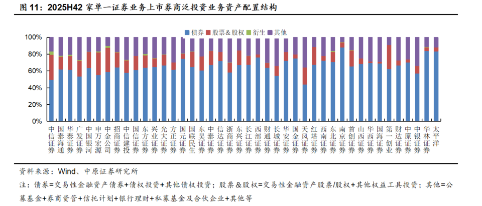 根据各公司合并财务报表,截至2025年6月底,42家单一证券业务上市券商泛投资业务资产配置中,债券、股票/股权、衍生、其他合计占比分别为60.73%、18.28%、1.21%、19.77%,较2024年底分别-0.22pct、+0.63pct、-0.73pct、+0.31pct。共40家上市券商固定收益类金融资产占泛投资业务资产配置中的比例超过50%,较2024年底持平,仅中信证券(49.78%)、天风证券(44.37%)固收资产配置比例在50%以下;共3家上市券商固收资产占比超过80%,较2024年底持平,分别为南京证券(88.37%)、华林证券(83.87%)、太平洋(83.43%)。整体看,虽然2025H固定收益市场明显降温,但上市券商泛投资业务资产配置仍以债券等固定收益类金融资产为主,固收资产配置比例较2024年底仅出现微幅下降。其中,32家中小券商固收资产的算术平均配置比例为68.01%,高于10家头部券商的59.00%。