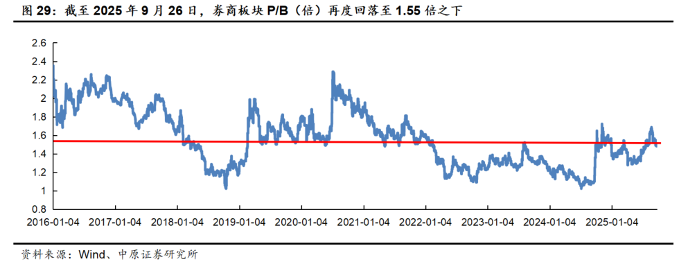 投资建议。政策面:2025年7月31日,中央政治局会议指出“增强国内资本市场的吸引力和包容性,巩固资本市场回稳向好势头”。可以预见,未来较长一段时期内资本市场仍将在巩固经济持续回升向好、抵御外部冲击影响、拓宽居民财产性收入渠道、助力并推动科技创新以及新质生产力发展等方方面面发挥重要作用。基本面:在“巩固资本市场回稳向好势头”的政策定调下,2025年四季度证券行业的整体经营环境有望保持当前风偏提升、交易活跃的基本格局,证券行业全年业绩实现增长的确定性较强。估值面:三季度券商板块的平均P/B整体围绕1.55倍的近十年平均估值波动。近期券商板块的走势明显转弱,预计主要由于行业整体经营业绩即将进入同比高基数期。在经历第三季度权益市场的指数型上涨行情后日均成交量、两融等关键业务指标均创历史新高,权益自营有望对冲固收自营的下行空间,券商板块持续走弱的空间相对有限。预计四季度券商板块平均P/B的核心波动区间将维持在1.40倍-1.60之间,积极保持对政策面、市场面以及券商板块的持续关注。建议关注龙头类、财富管理业务较为突出以及权益投资开展较为深入、个股估值明显低于板块平均估值的三类上市券商。