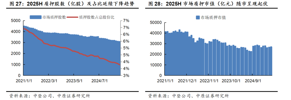 股票质押规模延续下降趋势。根据Wind统计的中登公司数据,截至2025年6月底,股票质押式回购市场质押股数、占总股份比、市场质押市值分别为3085.66亿股、3.78%、27038.07亿元,同比分别-12.91%、-0.63pct、+13.37%,较2024年底分别-4.76%、-0.25pct、-3.53%。其中,市场质押市值同比出现回升主要由于去年同期权益市场仍处于低迷期,导致同比基数低。
