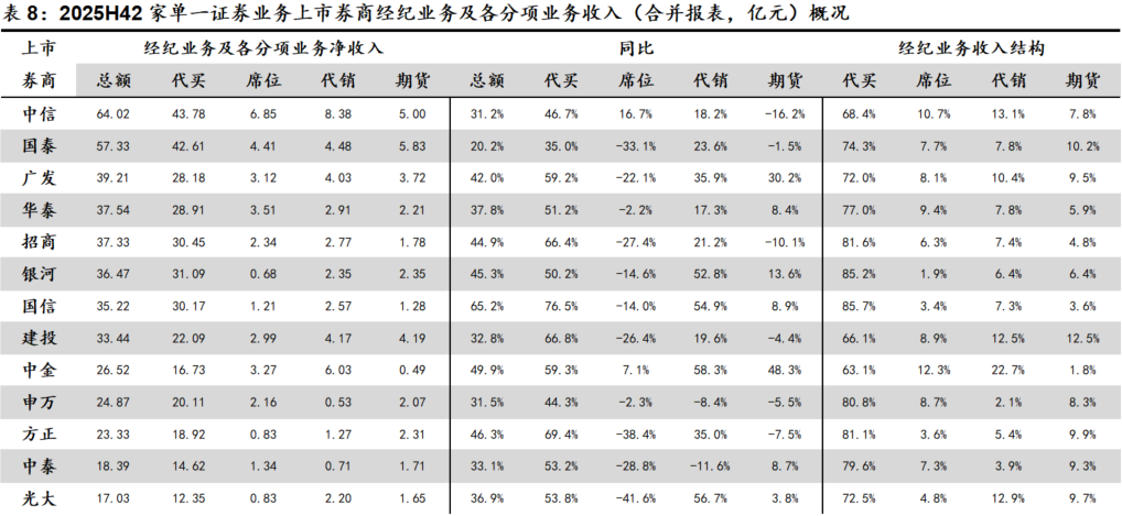 2025H经纪业务各分项业务中,代理买卖证券业务的增幅最为明显,代销金融产品业务同步实现明显回暖。从上市券商的具体表现看,部分机构经纪业务相对弱势、零售经纪业务占据主导的上市券商增幅靠前,零售经纪业务贡献了上半年经纪业务手续费净收入的主要增量。以交易单元席位租赁为代表的机构经纪业务连续第二年承压下行,收入占比明显下降。期货经纪业务净收入小幅回升,收入波动保持相对收敛状态,持续对合并口径经纪业务手续费净收入发挥稳定作用。