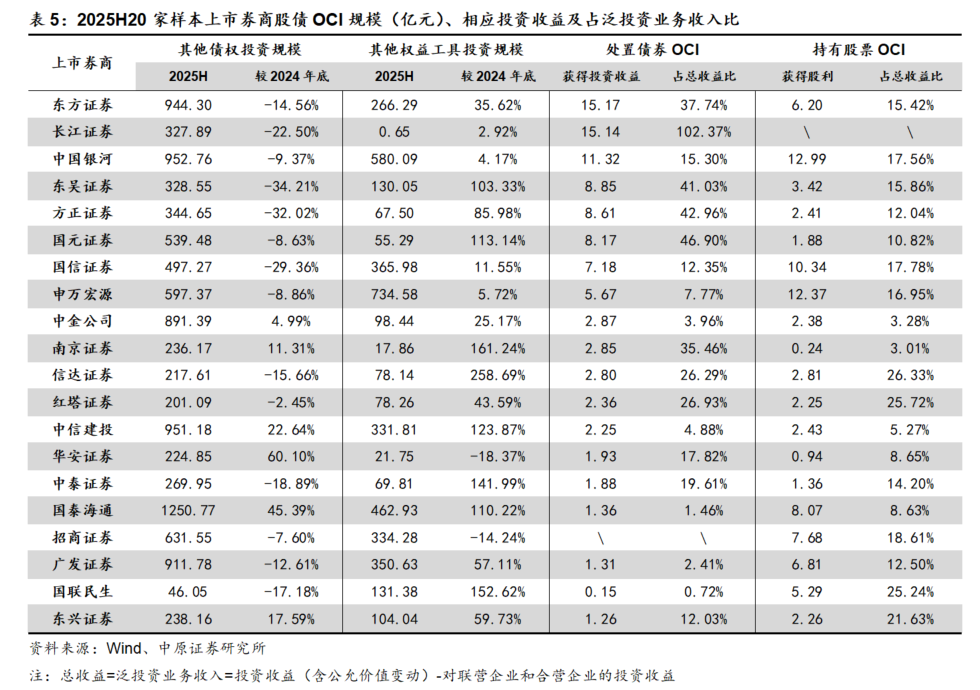 根据各公司合并财务报表,2025H处置债券OCI获得投资收益以及持有股票OCI获得股利分别排名前15位的上市券商共有20家样本上市券商。其中,2025H其他债权投资规模出现不同程度下降的样本上市券商共有14家,占比70%。报告期内处置债券OCI获得投资收益占泛投资业务总收益比排名前5位的样本上市券商分别为长江证券(102.37%)、国元证券(46.90%)、方正证券(42.96%)、东吴证券(41.03%)、东方证券(37.74%)。2025H其他权益工具投资规模出现增长的样本上市券商共有18家,占比90%。报告期内股票OCI规模增幅前5位的样本上市券商分别为信达证券(258.69%)、南京证券(161.24%)、国联民生(152.62%)、中泰证券(141.99%)、中信建投(123.87%),持有股票OCI获得股利占泛投资业务总收益比排名前5位的样本上市券商分别为信达证券(26.33%)、红塔证券(25.72%)、国联民生(25.24%)、东兴证券(21.63%)、招商证券(18.61%)。整体看,部分中小券商通过利用股债OCI的会计处理方式降低了市场波动对方向性业务、乃至整体经营业绩的扰动,并增厚了2025年上半年泛投资业务的收入规模。