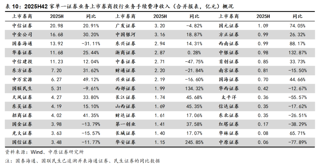 根据各公司合并财务报表,2025年上半年42家单一证券业务上市券商共实现合并口径投行业务手续费净收入155.30亿元,同比+7.69%(因国泰海通吸收合并海通证券、国联民生并表民生证券对同比数据进行追溯调整后),在连续三年显著下滑后实现边际改善。