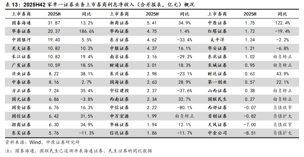 根据各公司合并财务报表,2025年上半年42家单一证券业务上市券商共实现合并口径利息净收入196.57亿元,同比+17.20%(因国泰海通吸收合并海通证券、国联民生并表民生证券对同比数据进行追溯调整后)。2025H上市券商利息净收入在连续三年下滑后企稳回升,一是两融业务利息收入同比实现回升;二是有息债务规模减少、降准降息周期下资金成本下降推动利息支出的降幅大于利息收入的降幅。