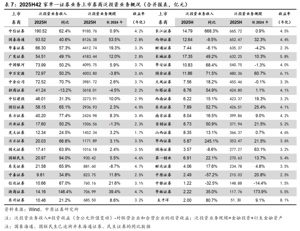 根据各公司合并财务报表,2025年上半年42家单一证券业务上市券商共实现合并口径投资收益(含公允价值变动)1182.67亿元,同比+50.10%(因国泰海通吸收合并海通证券、国联民生并表民生证券对同比数据进行追溯调整后);剔除对联营企业和合营企业的投资收益后,上市券商共实现泛投资业务收入1123.54亿元,同比+48.60%。截至2025年6月底,42家单一证券业务上市券商泛投资业务总规模(金融投资+衍生金融资产)为68323亿元,较2024年底+10.5%;泛投资业务平均投资收益率为3.45%(年化),较2024年+0.60个百分点。2025H上市券商泛投资业务明显回暖,一是上半年权益类自营业务的经营环境同比显著改善,上市券商权益方向性自营在同比低基数下实现明显修复;二是部分上市券商通过股票OCI账户增配高股息资产,期间持有的股利收入增厚了投资收益总额;三是受益于一级市场活跃度以及科创板跟投收益回升,上市券商另类投资子公司普遍实现扭亏为盈,投资收益贡献度显著提升;四是虽然上半年固收市场明显降温,但上市券商整体较好控制了固收方向性业务的回撤,部分上市券商把握住波段投资机会实现了优异的投资业绩;五是部分上市券商处置存量债券OCI释放投资收益有效对冲了固收自营的下滑压力。
