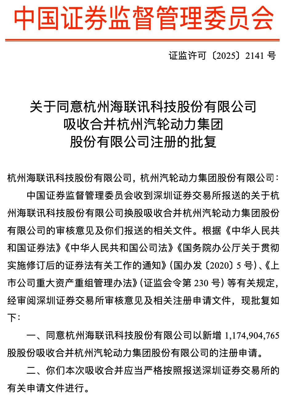 9月28日晚间,海联讯、杭汽轮B双双发布公告称,于2025年9月26日收到了中国证监会出具的《关于同意杭州海联讯科技股份有限公司吸收合并杭州汽轮动力集团股份有限公司注册的批复》。