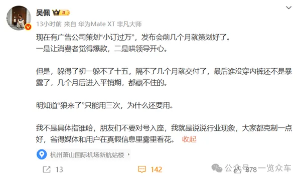 前段时间,知名汽车博主“吴佩”爆料称,现在有广告公司策划“小订过万”,发布会前几个月就策划好了。