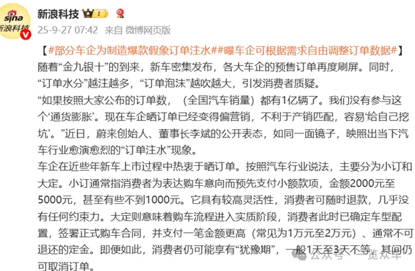 9月27日,据新浪科技报道,官媒《经济日报》公开发文表示,该给国内新能源车企订单泡沫挤水分了。