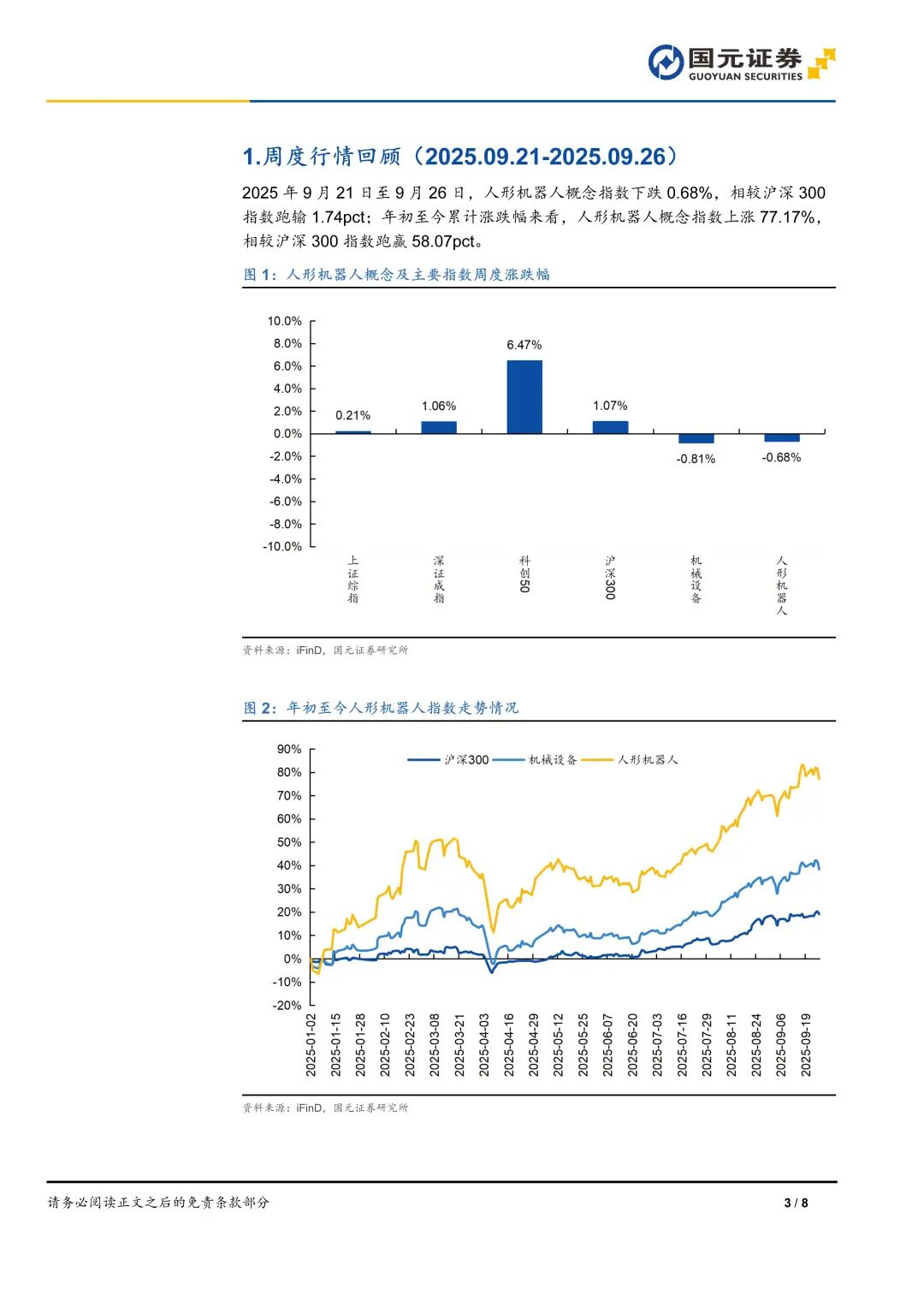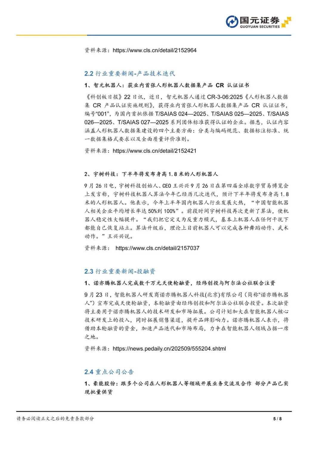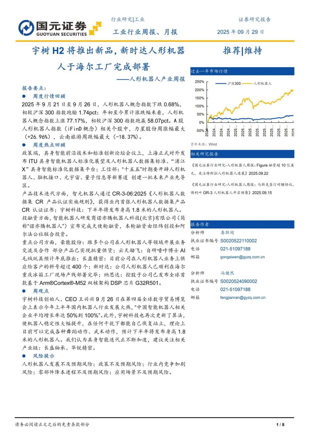 本报告摘自国元证券2025年9月29日已发布的《宇树H2将推出新品,新时达人形机器人于海尔工厂完成部署——人形机器人产业周报》,具体报告及分析内容请详见报告。若因对报告的摘编等产生歧义,应以报告发布当日的完整内容为准。